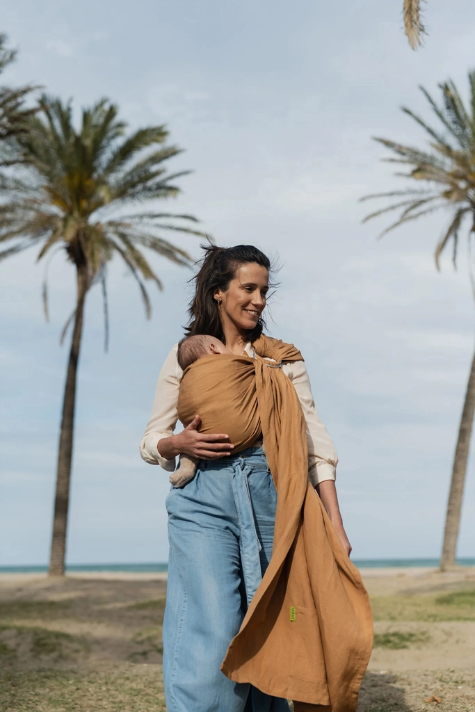 De lichte en ademende Boba Ring Sling draagdoek in de kleur Rye biedt snel omdoen zonder knopen, ergonomische ondersteuning en verstelling met metalen ringen. Geschikt vanaf de geboorte tot peuterleeftijd (3–15 kg), gemaakt van een luxueuze mix van linnen en bamboeviscose voor dagcomfort thuis en onderweg.