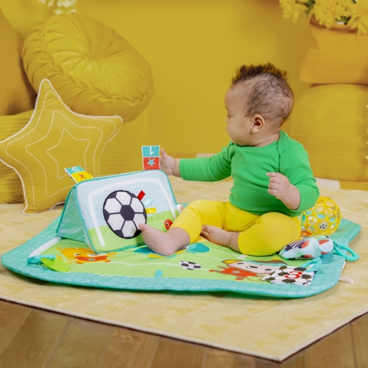 De gevoelige mat beloont elke schop en aanraking met meer dan 30 melodieën, geluiden en lichteffecten – motiveert tot bewegen en versterkt beentjes en buikje.