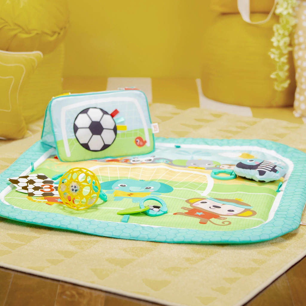 Inclusief 4+ afneembare speeltjes: kaartjes met cijfers en dieren, een pluchen toekan met belletje, getextureerde bladeren – bijtspeeltje en een klassieke, makkelijk vast te pakken OBALL. Ondersteun elke dag de eerste “goals” van je kleine voetballer.