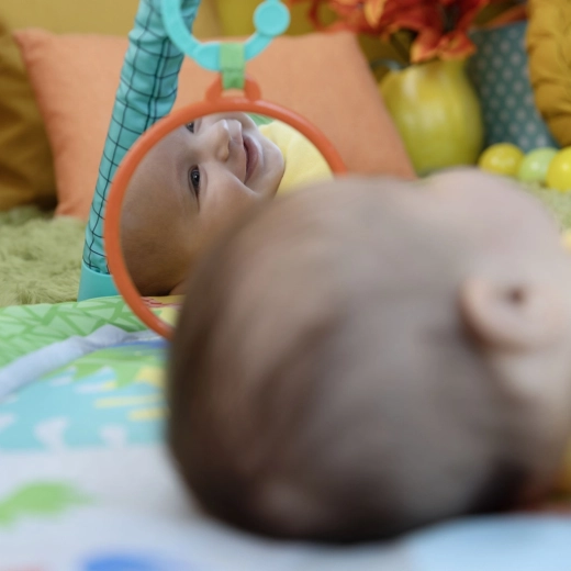 Een veilig spiegeltje, ringen, zonnetje en een blad-bijtspeeltje ondersteunen zelfbewustzijn en zintuiglijke ontwikkeling.