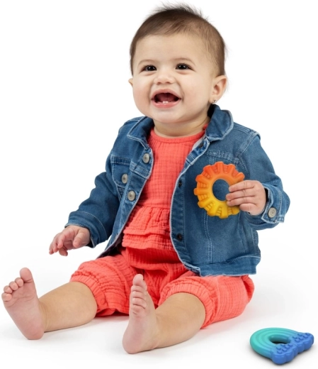 Verlicht gevoelige tandvleesjes met het duo siliconen bijtringen BRIGHT STARTS Chance of Smiles, geïnspireerd op het weer. Zijdezachte 100% BPA-vrije siliconen, getextureerde oppervlakken voor tandvleesmassage en een makkelijk vast te pakken vorm van zon en regenboog ondersteunen zelfkalmering en de ontwikkeling van de fijne motoriek van je baby.