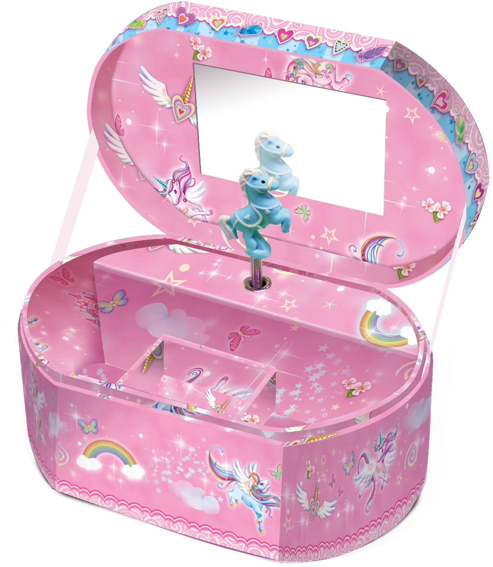 Een betoverende ovale sieradendoos met een eenhoornmotief die elke kleine prinses zal verrukken. Bij het openen speelt hij een prachtige melodie, biedt voldoende ruimte voor oorbellen, armbanden en kleine schatten en wordt een charmante decoratie voor de kinderkamer.