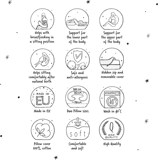 De Cebuszka Duo is ontworpen voor veeleisende moeders die tijdens de zwangerschap en bij het voeden comfort, ondersteuning en flexibiliteit willen combineren. Het tweedelige systeem met verschillende vullingen maakt nauwkeurige aanpassing mogelijk – een zachte deel onder het hoofd van holle vezel met siliconenafwerking en het hoofd-, langere deel van EPS‑microkralen, die zich naar het lichaam vormen en stabiele ondersteuning bieden.