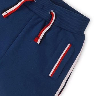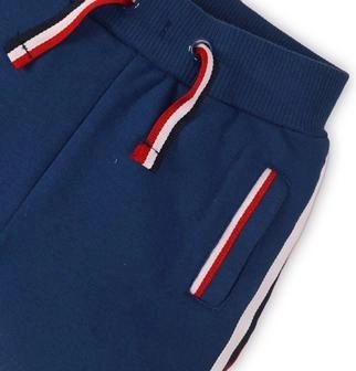 Contrasterende zijstrepen en afgebiesde zakken geven een moderne en frisse look, geschikt voor speelplaats en vrije tijd.