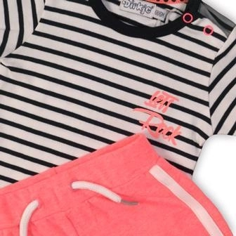 Kleed je kind in comfort en stijl met de DIRKJE set die praktisch gemak en een schattig design combineert. Het zwart‑wit gestreepte T‑shirt met een klein roze detail wordt aangevuld door roze short met witte bies. Dankzij de zachte katoen met een beetje elastaan vormt de kleding zich mooi naar het lichaam en belemmert deze de beweging niet.