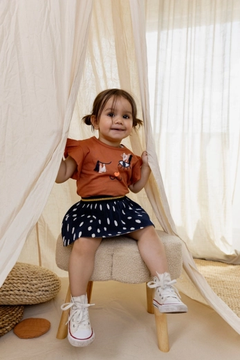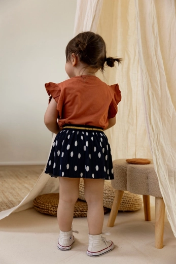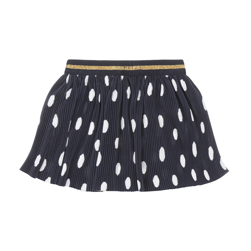 Stijlvolle meisjesrok DIRKJE in marineblauw met witte stippen en een geplisseerde snit voor speels volume. De comfortabele elastische tailleband met gouden streep zorgt voor een perfecte pasvorm en comfort de hele dag. Ideaal voor school, feestjes en vrije tijd – makkelijk te combineren en blijft prachtig in vorm.