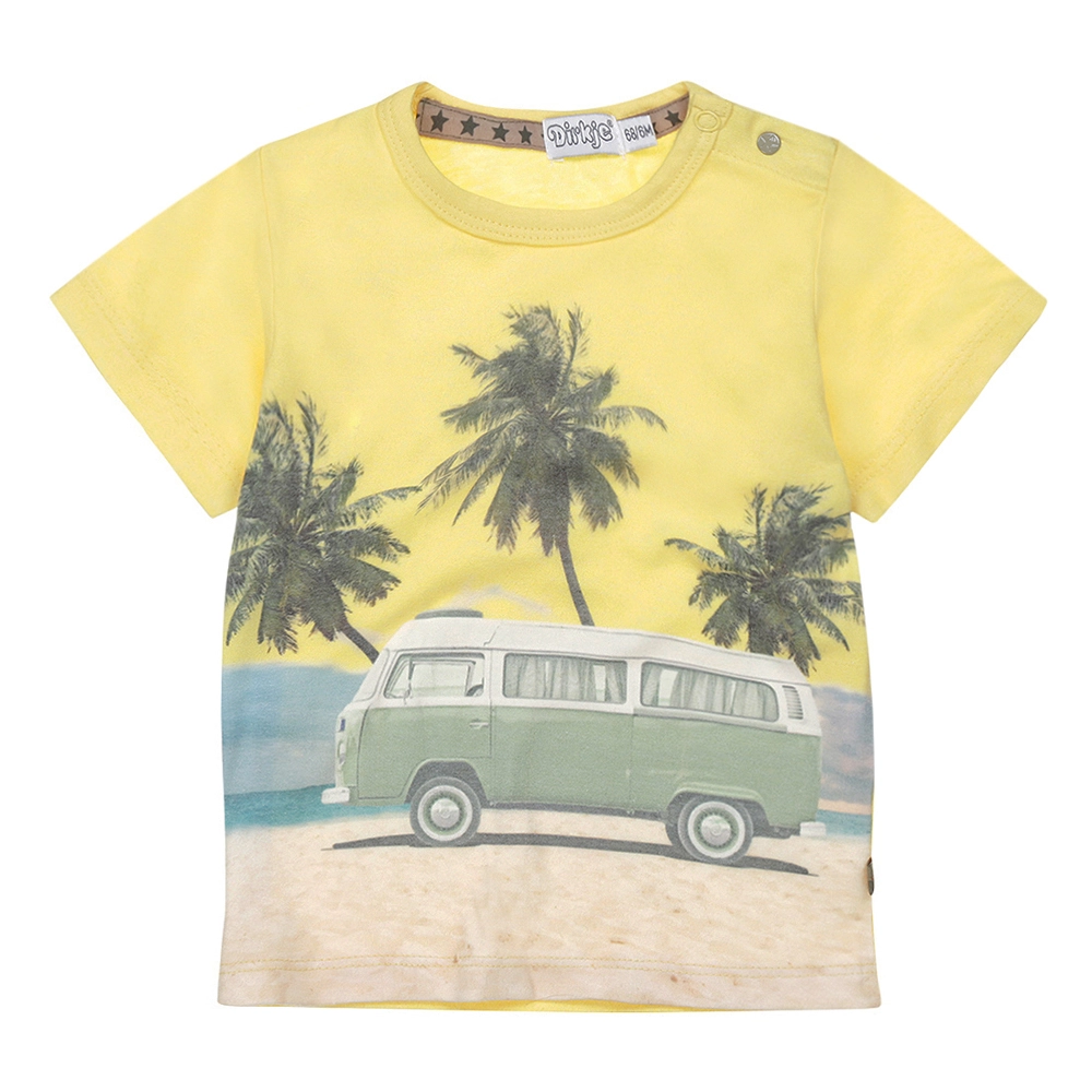 Stijlvol kinder-T-shirt in een heldergele kleur met een zomerse print van palmbomen en een retro busje, ideaal voor dagelijks dragen. Biedt zacht en comfortabel materiaal, praktische drukknoopsluiting op de schouder voor gemakkelijk aan- en uittrekken en kwalitatieve afwerking voor langdurig draagplezier.
