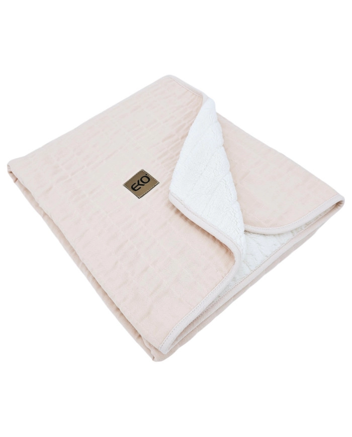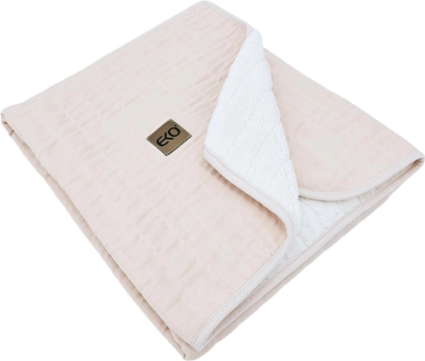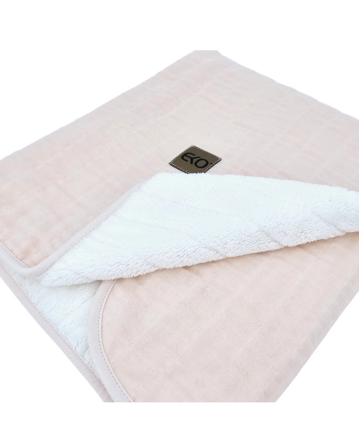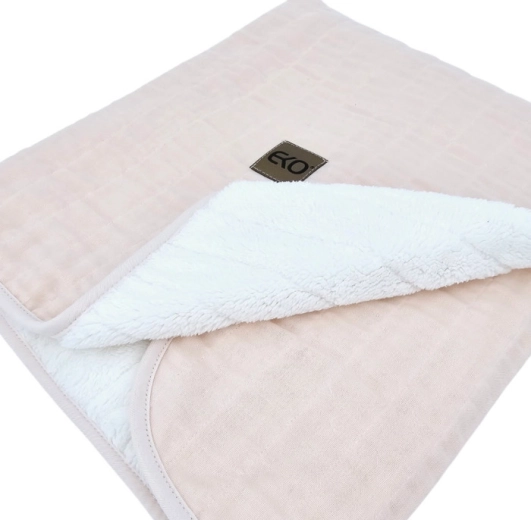 Deze EKO mousselinedeken in een zachte roze tint combineert natuurlijke 100% katoen aan de buitenkant met een warme bont- (fleece) voering van 100% polyester. De lichte maar effectieve isolatie van hypoallergene vezels zorgt voor aangename warmte zonder overbodig gewicht. De deken is het hele jaar door gemakkelijk te gebruiken – thuis, onderweg en tijdens wandelingen.