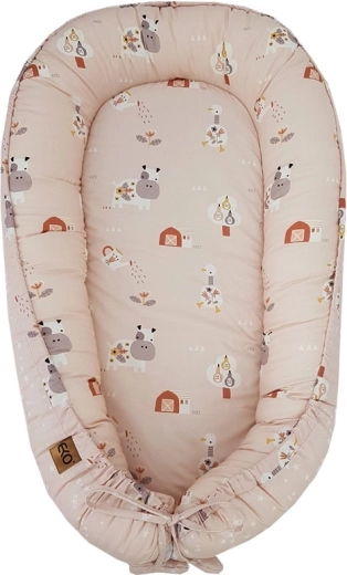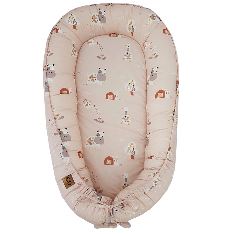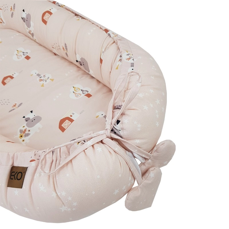 Het EKO-babynest My Farm Stars Powder Pink in het formaat 90 × 60 cm is ontworpen voor een rustige slaap en comfortabel rusten onder jouw toezicht. De hoge randen helpen een knus omhullend gevoel te creëren en vergemakkelijken zijligging, wat vooral prettig is bij refluxklachten. De zachte katoenen hoes en de luchtige, hypoallergene vulling zorgen voor een milde aanraking met de huid en comfort in elke houding.