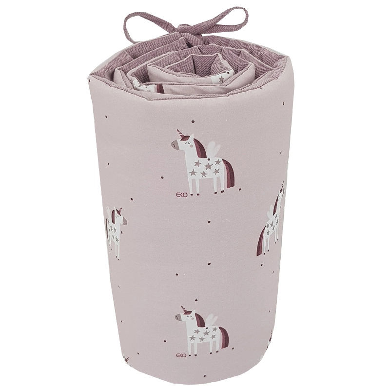 De EKO Unicorn bedbumper van 180 × 35 cm beschermt je kindje tegen contact met de spijlen en tegen tocht. Eén zijde van bedrukt 100% katoen en de andere van VELVET biedt een aangenaam gevoel en een elegante uitstraling. De vulling bestaat uit hypoallergene siliconen holle vezel, die licht, ademend en vormvast is.