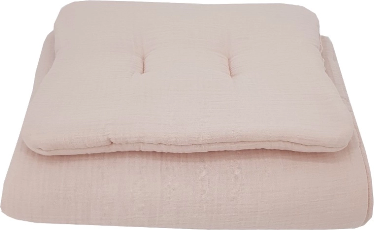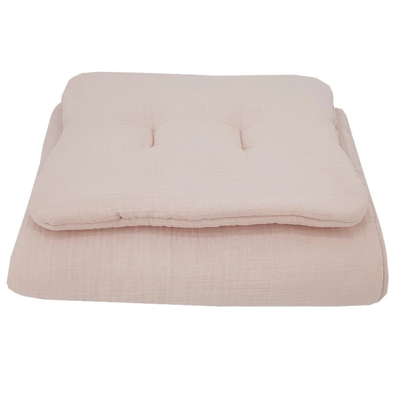 Het bijpassende kussen 30 × 40 cm en de deken 75 × 100 cm vullen het babybedje prachtig aan in de zachte kleur powder pink.