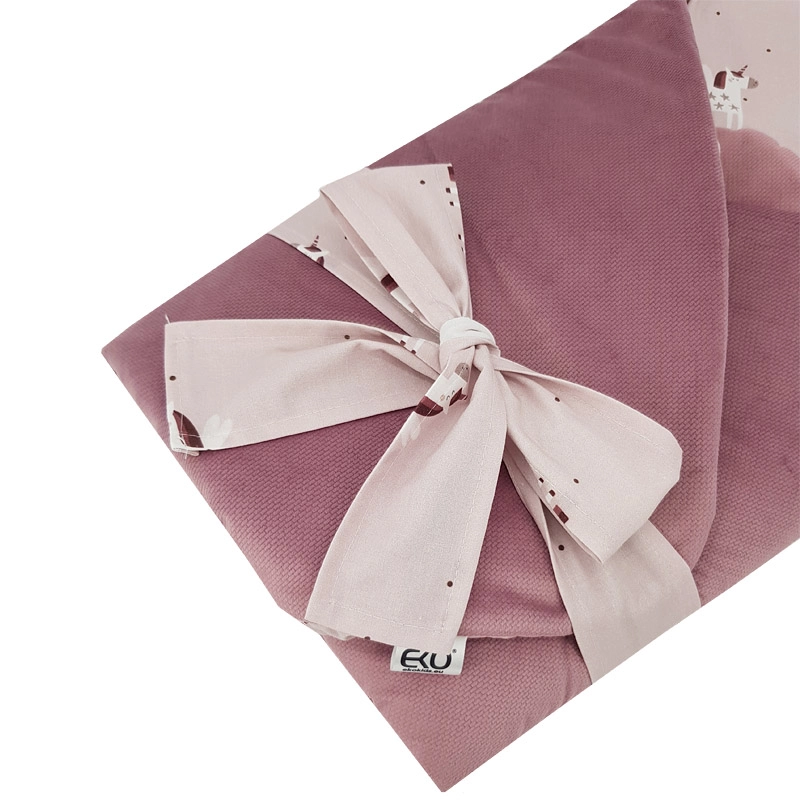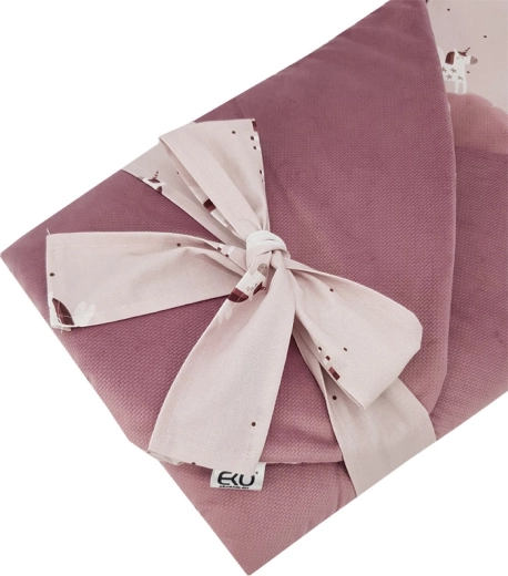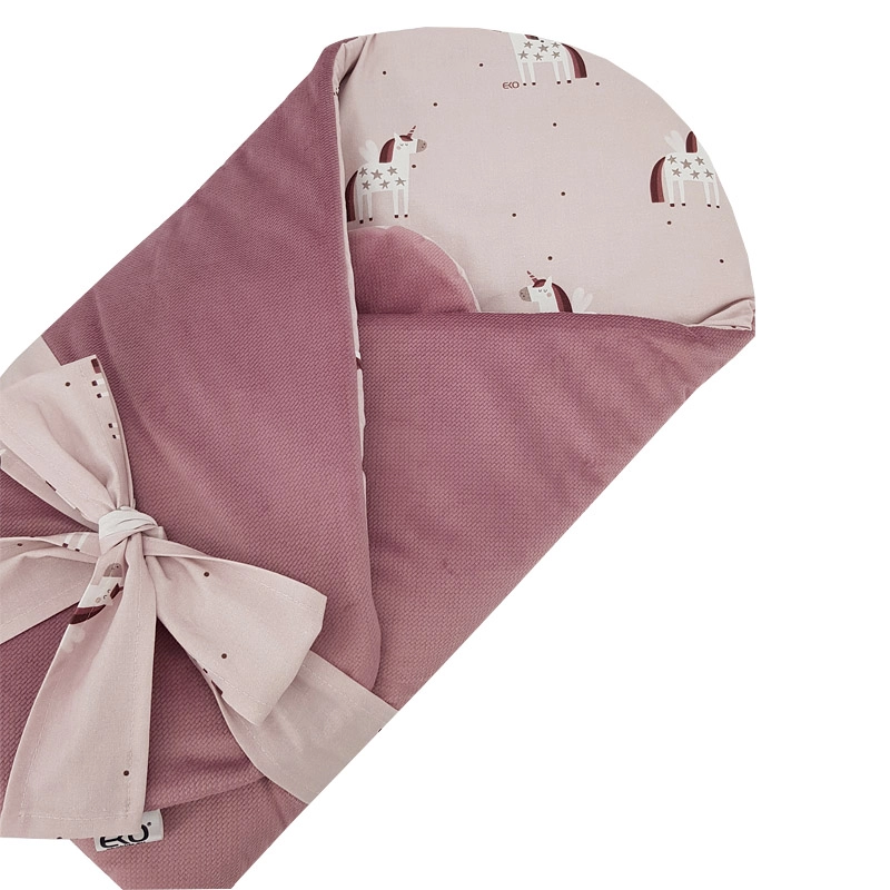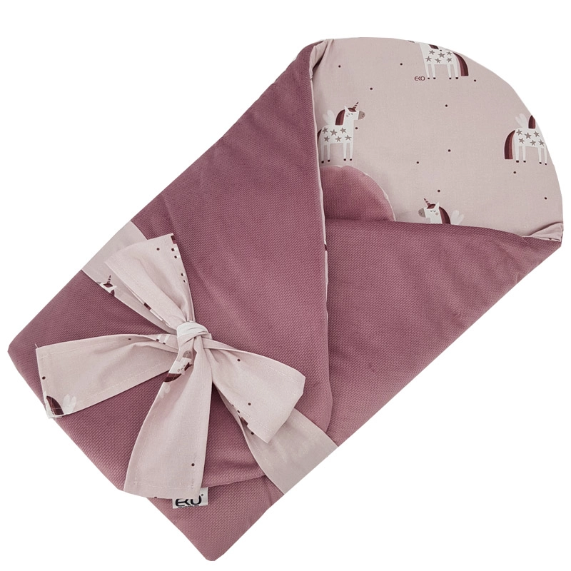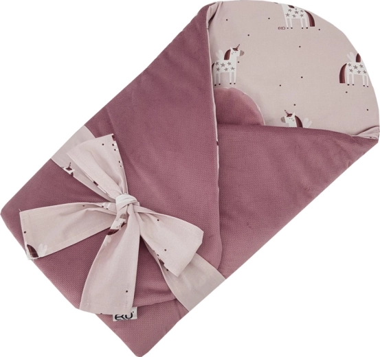Stijlvolle wikkeldoek voor baby’s met Unicorn-motief, met aan de buitenkant zacht velvet en aan de binnenkant comfortabele katoen. Bevat een uitneembare kokos-inleg voor een stevigere grip in de eerste weken, een hypoallergene vulling voor comfort en warmte en een praktische striksluiting voor eenvoudig en verstelbaar aansnoeren.