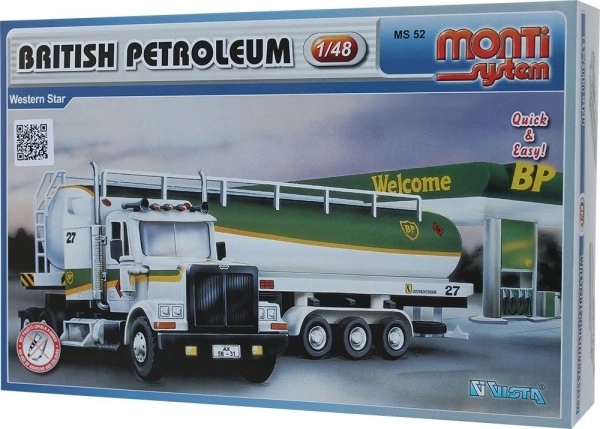 Bouw een stijlvolle BRITISH PETROLEUM-model in schaal 1:48 van MONTI SYSTEM – eenvoudige bouwset zonder lijm en zonder schilderen, ideaal voor kinderen vanaf 8 jaar en beginnende modelbouwers.