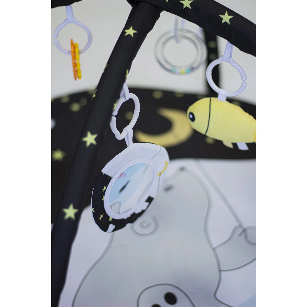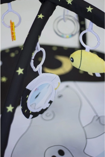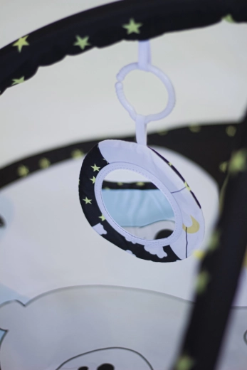 Dankzij twee afneembare speelbogen en vier hangspeeltjes aan C-ringen traint je kind de grijpreflex, oog-handcoördinatie en motoriek. De variabele constructie biedt drie gebruiksmodi: een klassiek speelkleed met boog, een kleed met overkapping en een tipi-tent voor fantasierijk spel.