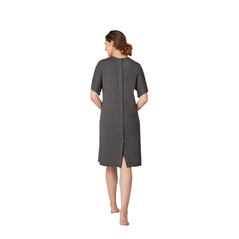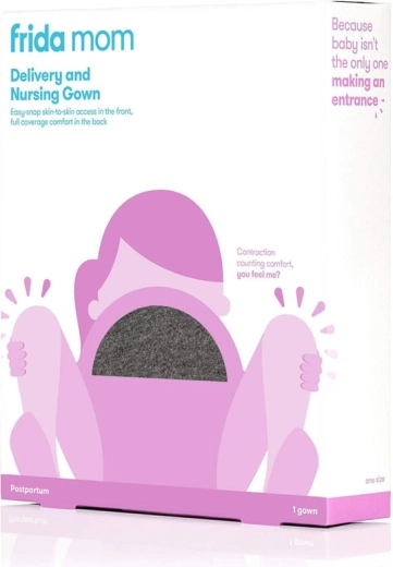 Praktische en comfortabele geboorte- en voedingsjurk FRIDA MOM met volledige rugbedekking met drukknoopjes, snelle opening aan de voorkant voor skin-to-skin en borstvoeding en zachte, ademende jersey met zakken. De universele pasvorm is licht, rekbaar en aangenaam op de huid – ideaal voor in het ziekenhuis en tijdens het kraambed.