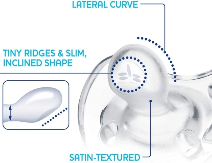 Dankzij de versmalde en flexibele speenhals kan het kind de mond gemakkelijk sluiten en wordt het risico op onevenwichtige tandbogen verminderd. De volledig siliconen constructie is ook ideaal om mee te slapen en comfortabel voor dagelijks gebruik. De praktische achterste ring maakt zacht vasthouden of bevestigen aan een universele clip mogelijk.