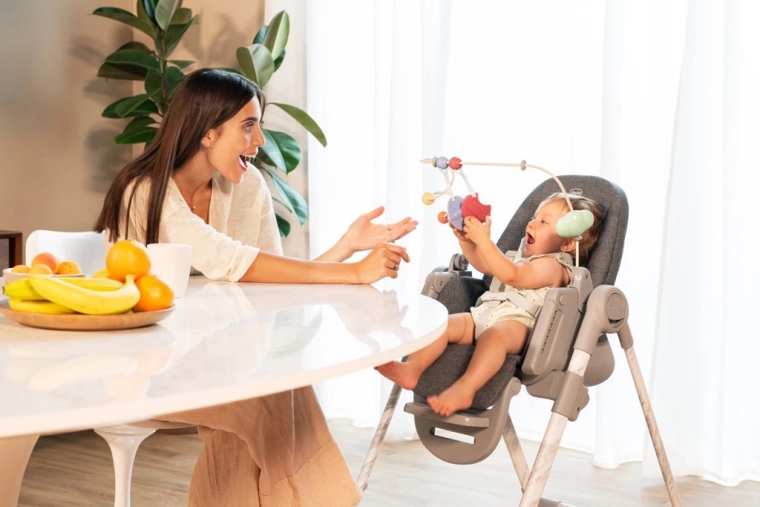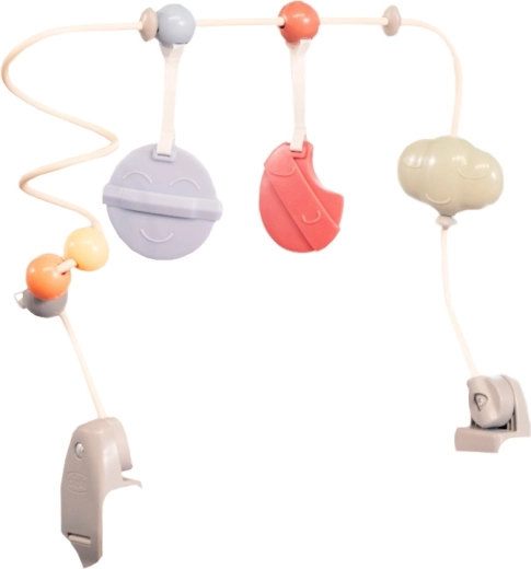 Ontworpen voor veilig en comfortabel gebruik: de zachte hangers kunnen op elk moment worden verwijderd en gebruikt als bijtspeeltje bij doorkomende tandjes, de boog bevestig je eenvoudig aan de Polly Armonia stoel en je stelt de hellingshoek zo in dat de speeltjes op de optimale afstand van het gezicht van het kind hangen.