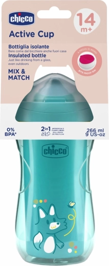 Chicco Active is een duurzame thermobeker ontworpen voor kinderen vanaf 14 maanden die leren zelfstandig te drinken. De smalle harde tuit met stevige rand helpt bij de overgang naar drinken als uit een glas, terwijl het betrouwbare ventiel het lekken beperkt tijdens het drinken en in beweging. De ergonomische vorm ligt goed in zelfs kleine handjes.