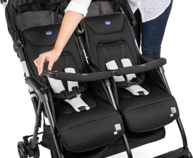 De CHICCO Ohlala Twin is een uitzonderlijk lichte (8 kg) en ultracompacte sportieve tweelingkinderwagen die je met één hand kunt inklappen en die zelfstandig blijft staan wanneer hij is ingeklapt. Elke zitting kan volledig afzonderlijk worden versteld tot de ligpositie, zodat het ene kind kan uitrusten terwijl het andere de wereld bekijkt.
