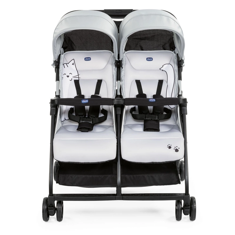 De ultralichte en compacte tweelingkinderwagen CHICCO Ohlala Twin in het design Silver Cat biedt comfort vanaf de geboorte, met één hand inklapbaar en onafhankelijk verstelbare zittingen. Dankzij de 5-puntsgordels, ruime mand en regenhoes in de set is hij ideaal voor dagelijkse wandelingen en op reis.