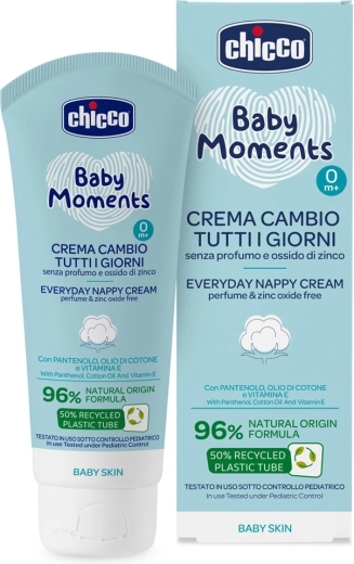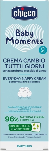De Chicco Baby Moments crème zonder zinkoxide is ontworpen voor milde dagelijkse verzorging van de gevoelige babyhuid in het luiergebied. De lichte, snel intrekkende textuur laat de huid zacht, gevoed en beschermd achter zonder witte waas. De parfumvrije formule minimaliseert het risico op irritatie en is dermatologisch getest op de gevoelige huid.