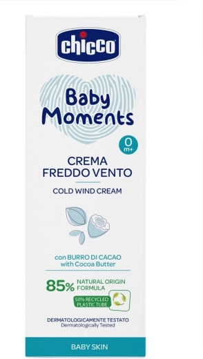 De milde beschermende crème CHICCO Baby Moments beschermt de gevoelige babyhuid tegen kou en wind. De formule met 81% natuurlijke ingrediënten, cacaoboter en sheaboter, panthenol en Omega-3 oliën versterkt de huidbarrière en laat de huid zacht en gevoed aanvoelen. Vrij van parabenen, kleurstoffen en alcohol, met de zachte Baby Moments-geur. Dermatologisch en oftalmologisch getest, geschikt vanaf de geboorte.