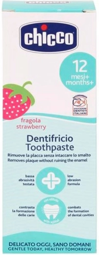 Zachte kindertandpasta CHICCO met aardbeiensmaak is zonder fluoride en zonder conserveringsmiddelen, mild voor gevoelig tandvlees en melktanden. Bevat bio-calcium ter versterking van de tanden en xylitol, dat helpt gaatjes te voorkomen. De niet-schurende formule is ideaal voor de dagelijkse mondhygiëne vanaf de eerste tand.