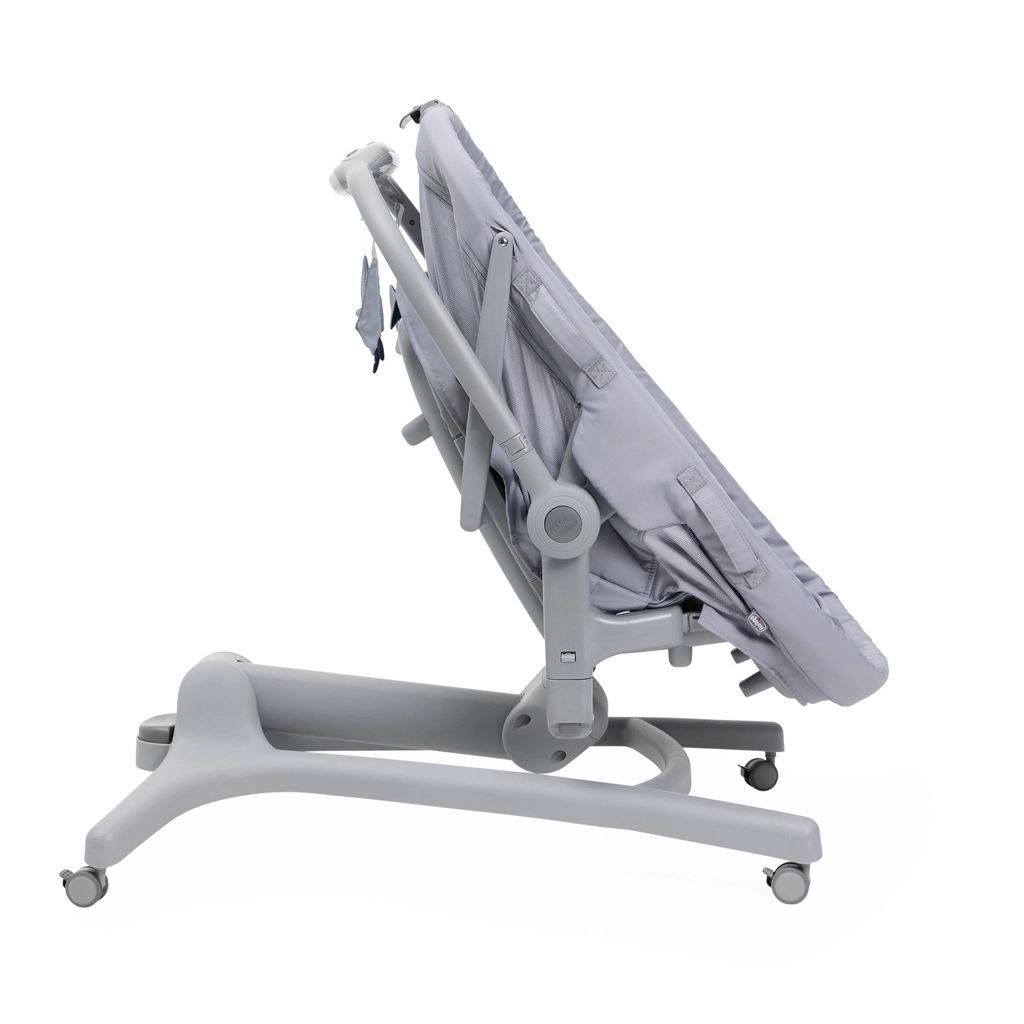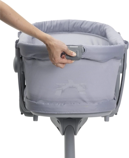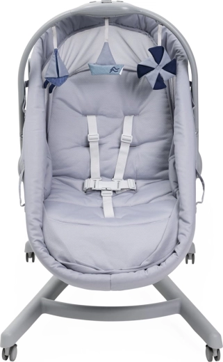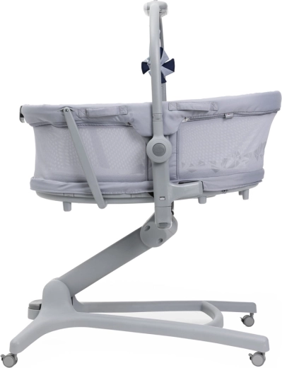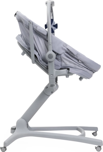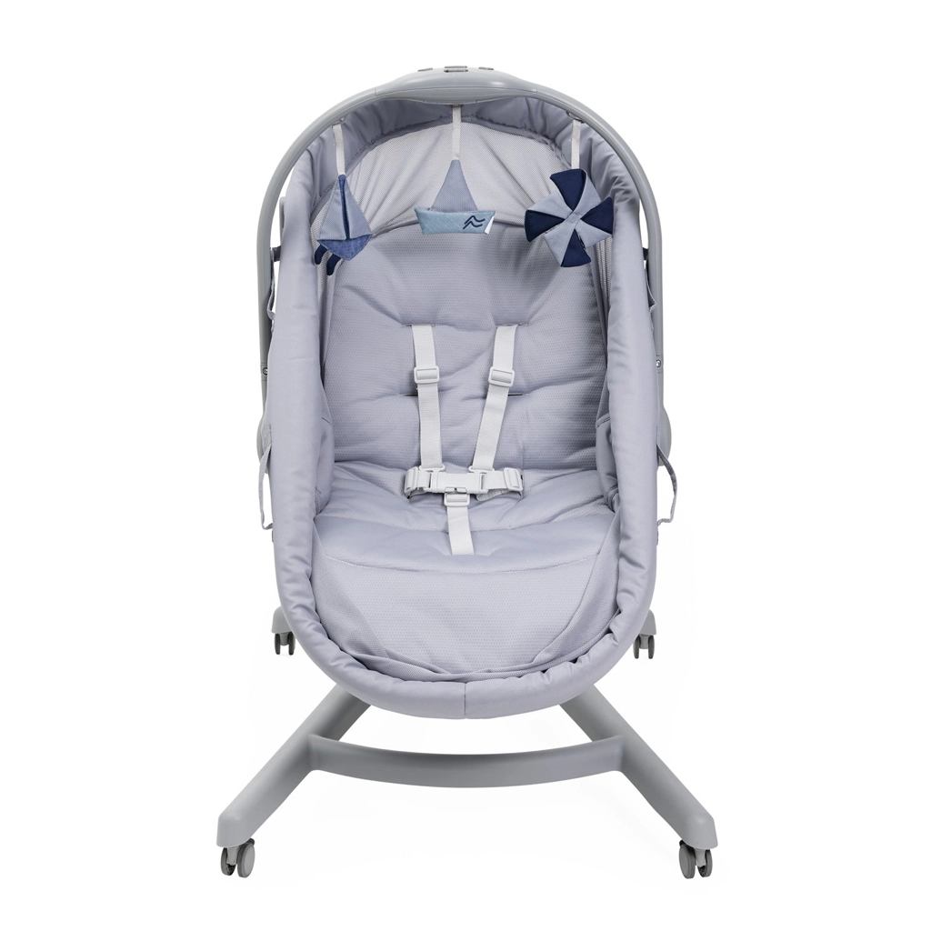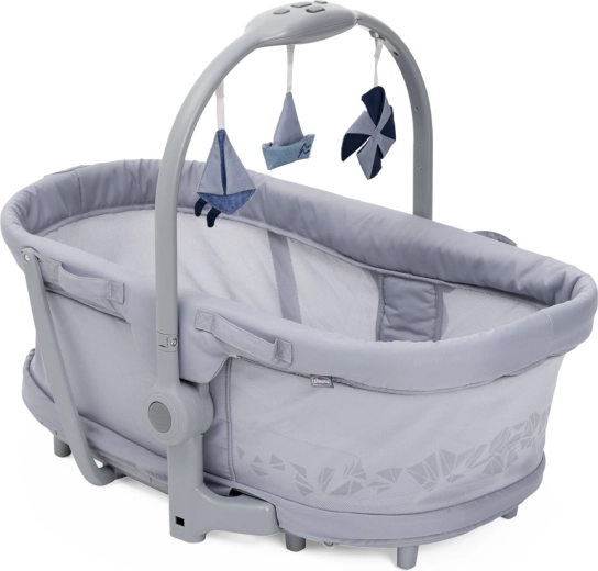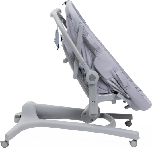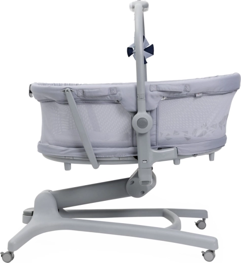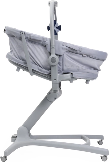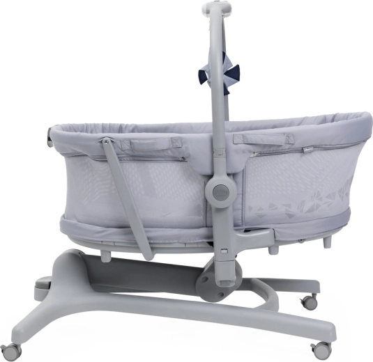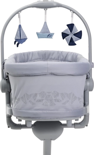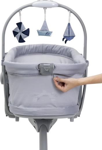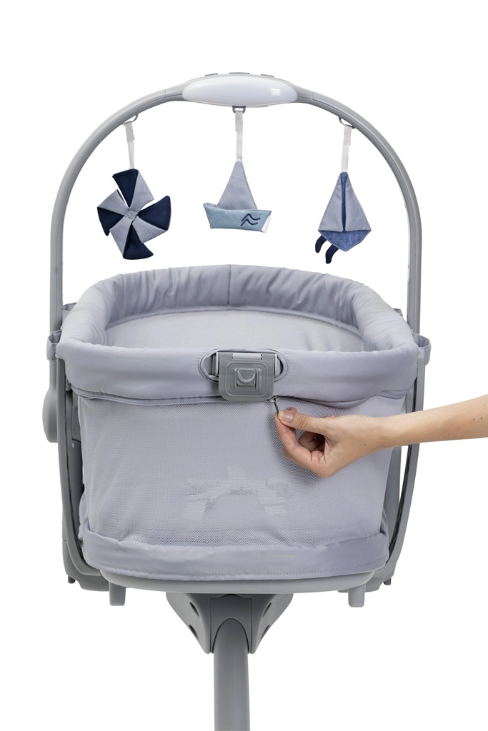 Eenvoudige hoogtebediening met één pedaal en een verstelbare rugleuning bieden ergonomie bij zowel in slaap wiegen als voeden. Inclusief een zachte, afneembare en afwasbare verkleiner voor pasgeborenen en een elektronische speelboog met 3 hangspeeltjes voor zintuiglijke ontwikkeling. De moderne stoffering geeft het product een tijdloze look; de hoezen zijn eenvoudig afneembaar en wasbaar.