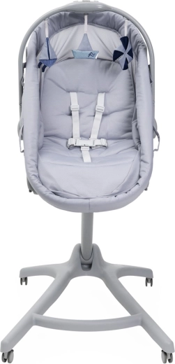 - 5-in-1: wiegje op standaard, losstaande wieg (mand), zitstoeltje, kinderstoel, eerste fauteuil