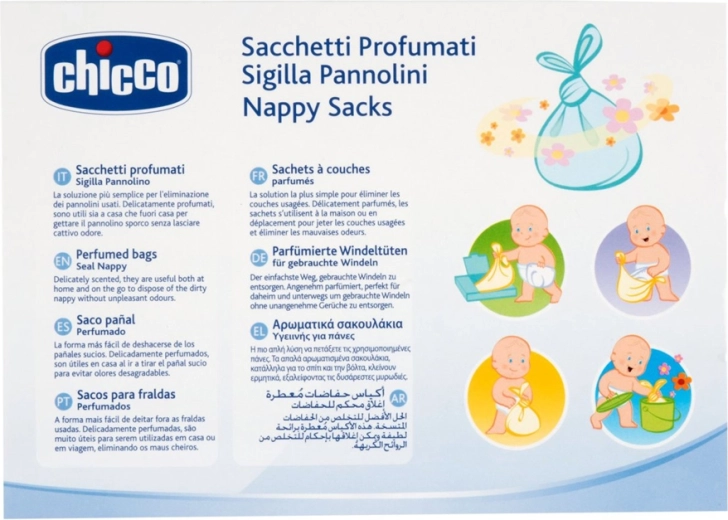 Geen onaangename geurtjes meer bij het weggooien van gebruikte luiers. De geparfumeerde CHICCO-zakjes bieden een eenvoudige manier om snel en hygiënisch luiers te verwijderen zonder dat de geur zich door de woning of auto verspreidt. Stop de luier in het zakje, sluit het en gooi het bij het restafval.