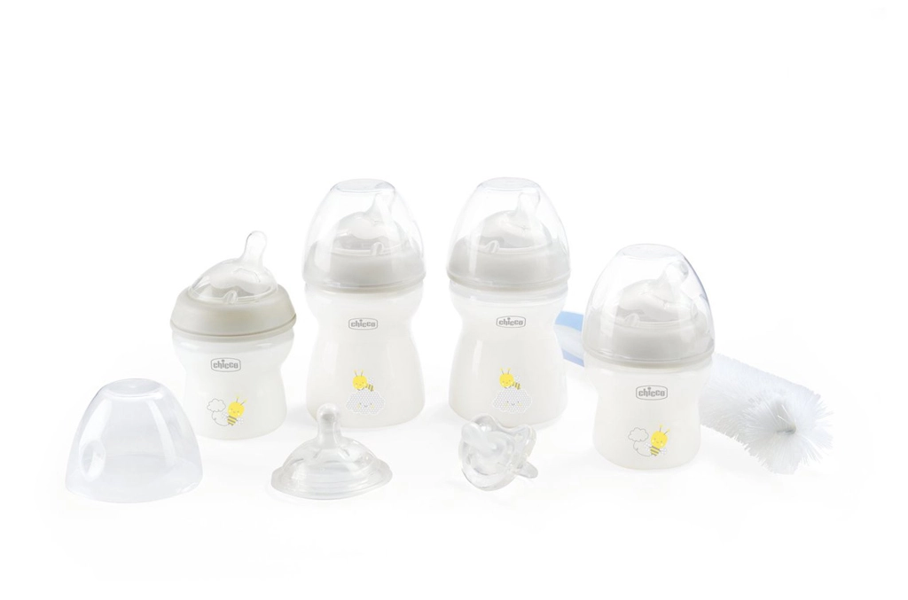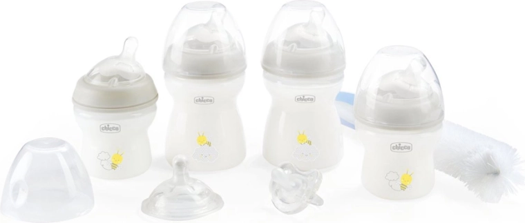 Complete geschenkset voor de eerste maanden van je baby met CHICCO Natural Feeling flessen en accessoires voor eenvoudig voeden en kalmeren. Bevat 4 flessen in verschillende maten, reservoirspenen, volledig siliconen fopspeen Physio Soft en een borstel voor flessen en spenen. De spenen met anti-koliekventiel ondersteunen natuurlijk aanhappen en comfortabel voeden vanaf de geboorte.