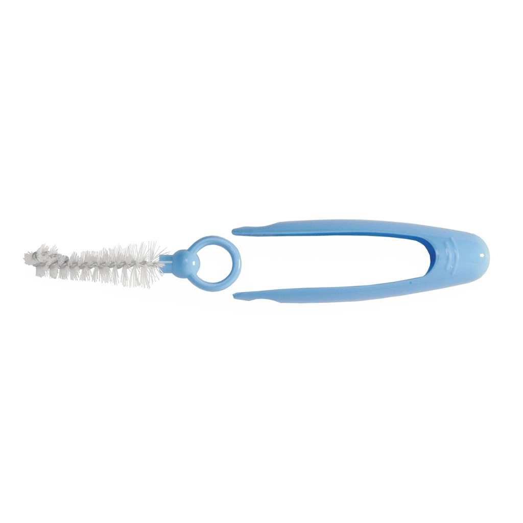De set bevat een borstel voor flessen en spenen en praktische tangetjes voor hygiënische hantering van gesteriliseerde onderdelen zonder handcontact.