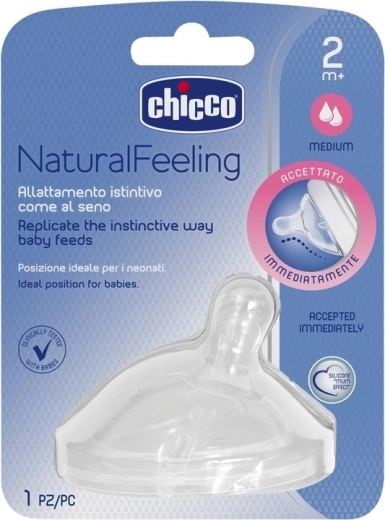 De siliconen speen Chicco Natural Feeling met medium doorstroom voor kinderen vanaf 2 maanden ondersteunt natuurlijk zuigen en een comfortabele houding tijdens het voeden. Dankzij de borstvormige vorm vergemakkelijkt hij de overgang tussen borstvoeding en fles. Het dubbele anti-koliekventiel helpt luchtinslikken te verminderen en verkleint het risico op kolieken, een opgeblazen gevoel en spugen. Compatibel met alle flessen van Chicco Natural Feeling. Verpakking bevat 1 stuk.