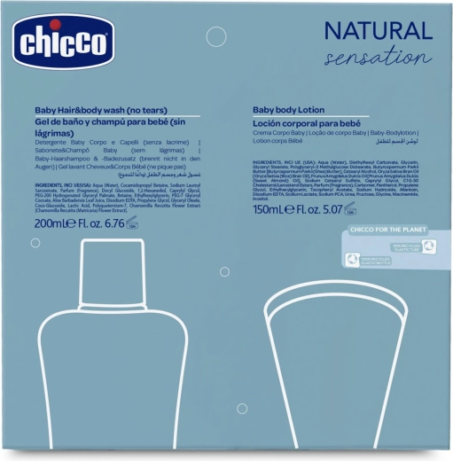 Ontdek de zachte verzorging van babyhuid met de cadeauset CHICCO Natural Sensation Daily Care, geschikt vanaf de geboorte. De praktische duo van een 2-in-1 shampoo voor haar en lichaam en een bodylotion met sheaboter en vitamine E reinigt mild, voedt en beschermt de gevoelige huid, respecteert de natuurlijke pH en laat de huid zacht en heerlijk geparfumeerd achter. Goedgekeurd door kinderartsen en dermatologen, gemaakt in Italië.