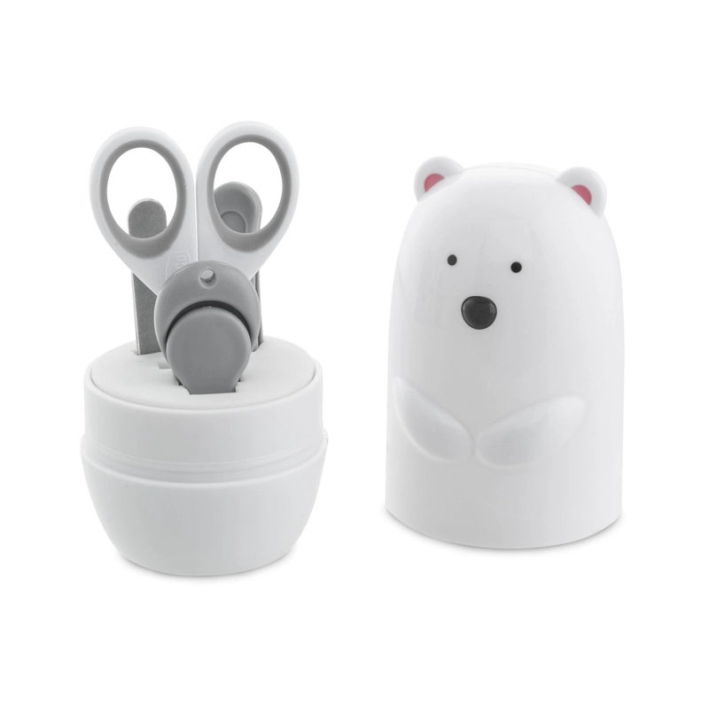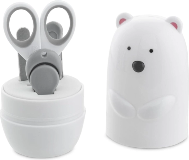 Praktische manicure set voor kindernagels 4-in-1 in een schattige etui in de vorm van een ijsbeer. Bevat alles wat nodig is voor het veilige en zachte knippen en verzorgen van nagels vanaf de geboorte – roestvrijstalen schaartje, 2 vijljes, nagelknipper met antislip en een pincet. Ideaal voor de babyuitzet en voor onderweg.