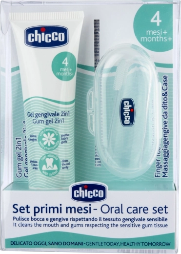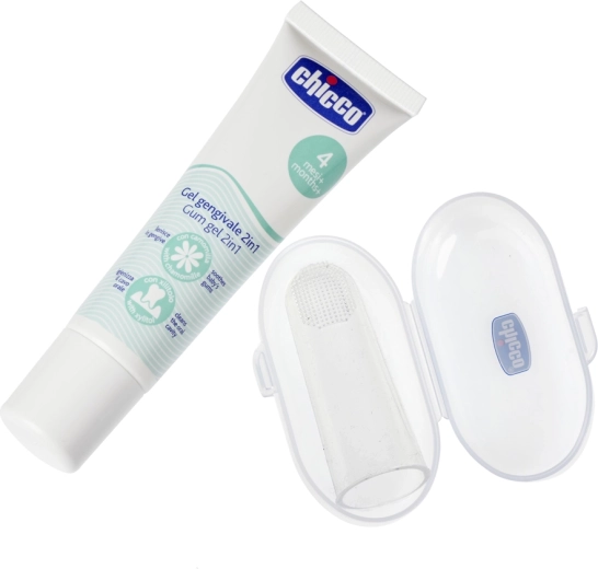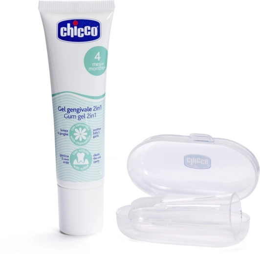 Verlicht gevoelige tandvlees tijdens het doorkomen van de eerste tandjes met de praktische CHICCO-set – kalmerende tandvleesgel met kamille en xylitol en een siliconen vingertandenborstel met een hygiënisch etui. De gel is smaakloos, veilig om door te slikken en biedt dankzij de verfrissende geltextuur onmiddellijke verlichting. De zachte borstelhaartjes van het vingerdopje zorgen voor een zachte massage van het tandvlees en milde verzorging van de eerste tandjes vanaf de geboorte.