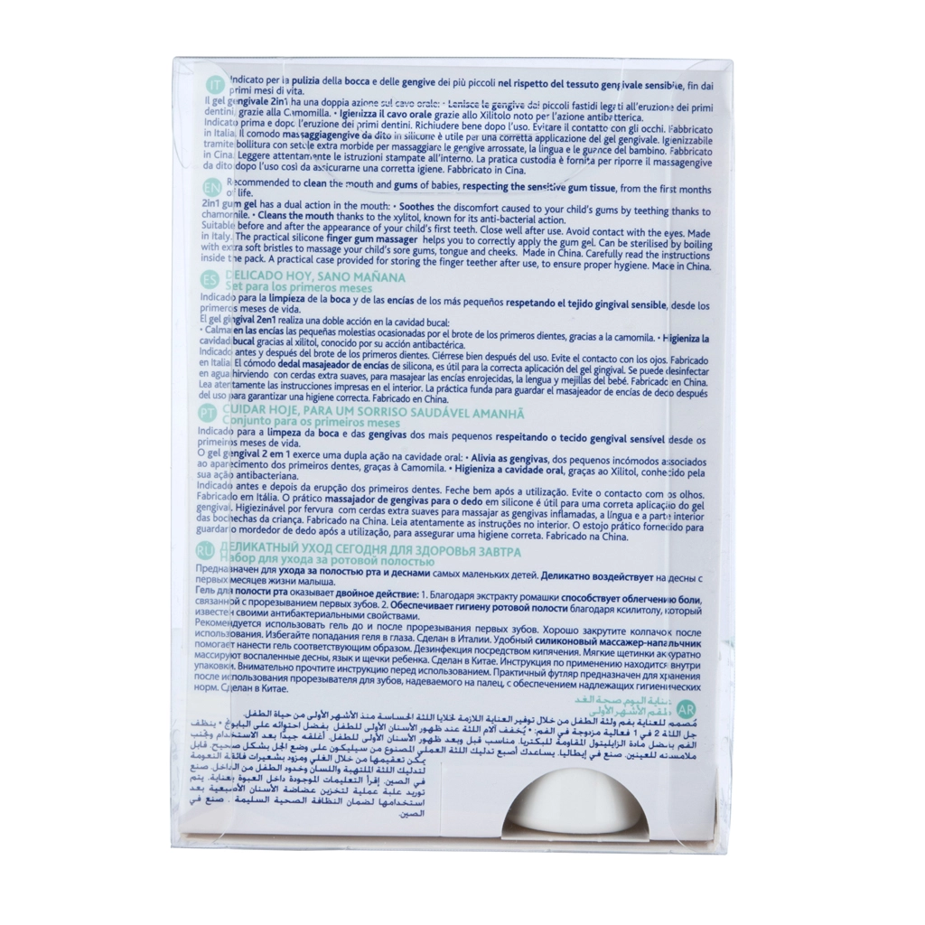 De siliconen vingertandenborstel maakt precieze en milde aanbrenging van de gel mogelijk en zorgt tegelijkertijd voor een zachte massage van het tandvlees en het reinigen van de eerste tandjes. Dankzij de zachte borstelhaartjes is de verzorging veilig en comfortabel. De verpakking bevat een praktisch hygiënisch etui voor schone en eenvoudige opslag en vervoer, thuis en onderweg.