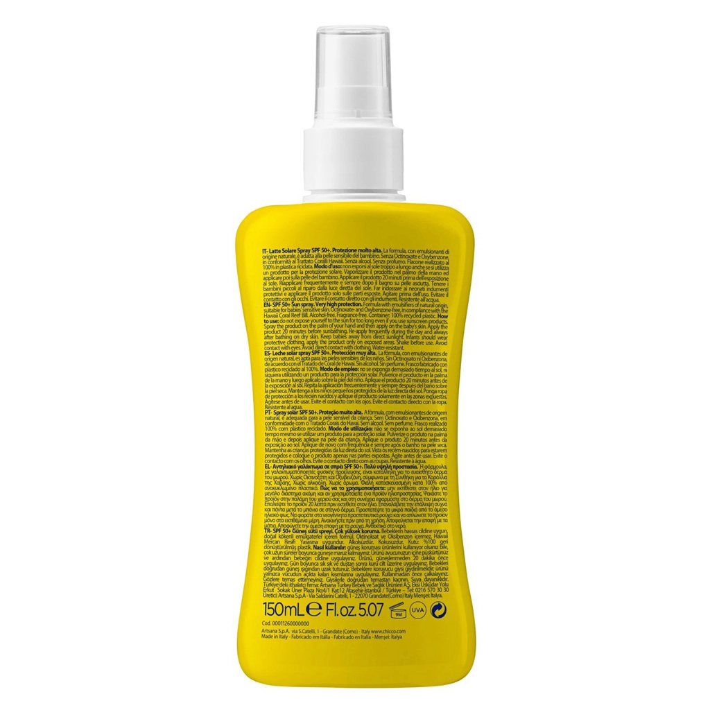 Bescherm de gevoelige kinderhuid met de CHICCO zonnebrandspray met zeer hoge bescherming SPF 50+. Biedt breed-spectrum bescherming tegen UVA/UVB en IR, is hypoallergeen, waterbestendig en heeft een lichte, niet-vette textuur voor eenvoudige dagelijkse toepassing vanaf 0 maanden.