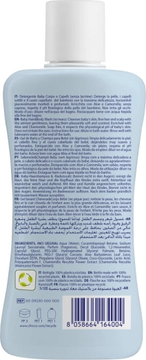 Zachte douchegel en shampoo 2-in-1 voor baby’s vanaf de geboorte reinigt mild lichaam en haartjes in één stap. Bevat aloë vera voor hydratatie en kalmering en kamille voor extra zachtheid. Spoelt gemakkelijk af, droogt de gevoelige huid niet uit, laat haar zacht en heerlijk geparfumeerd achter en maakt haartjes goed doorkambaar. Ontwikkeld en getest door kinderartsen en dermatologen, gemaakt in Italië.