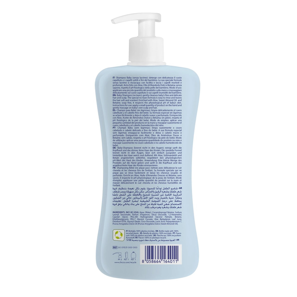 Zachte babyshampoo CHICCO Natural Sensation met aloë voor dagelijks wassen vanaf de geboorte. Reinigt mild, beschermt de natuurlijke pH en laat het haar zacht, geurend en makkelijk doorkambaar achter. Bevat aloë vera voor hydratatie en kalmering en zoete amandelolie voor verzachting. Dermatologisch en pediatrisch getest, gemaakt in Italië.