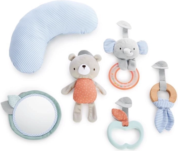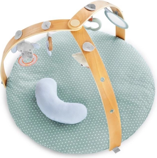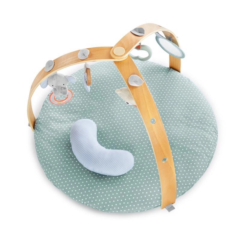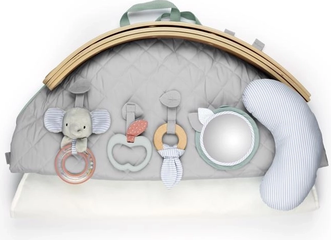 - dubbelzijdige gewatteerde mat, 2 gekruiste gyms, hangspeeltjes (incl. veiligheidsspiegeltje en bijtspeeltje), ondersteunend kussentje
