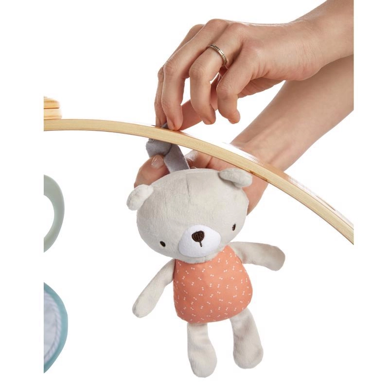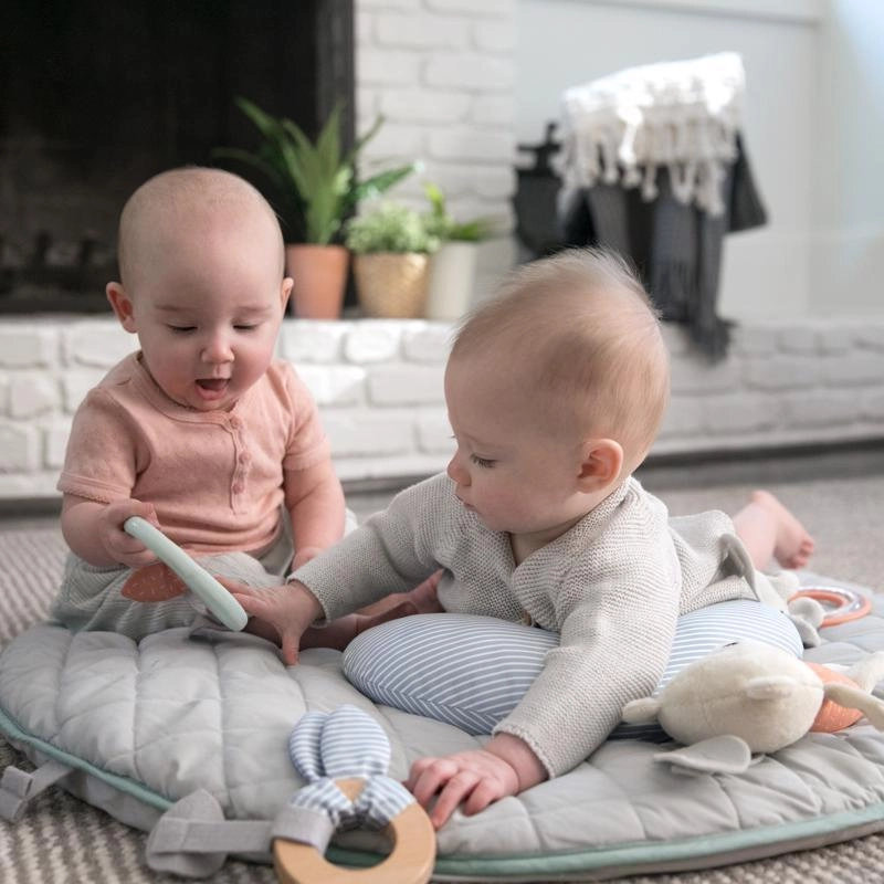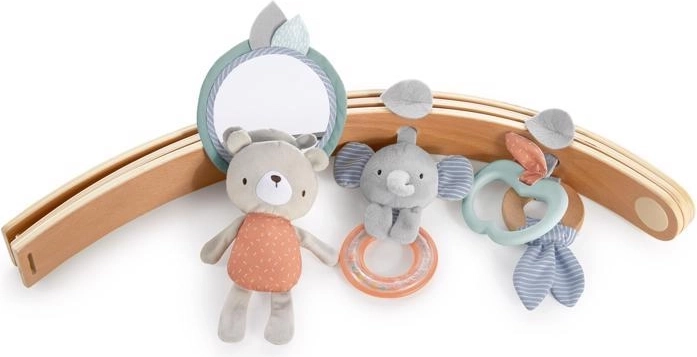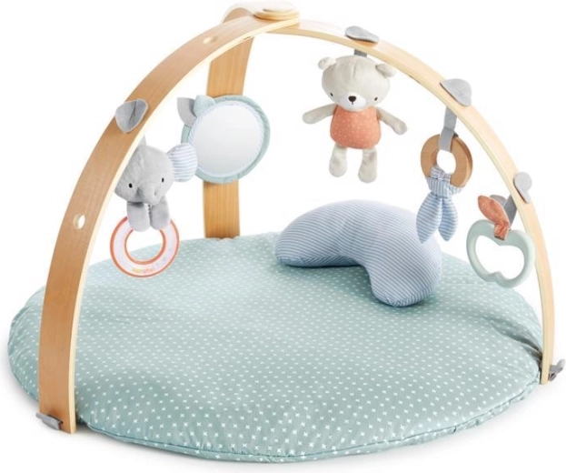 Twee gekruiste gyms in houtlook met zachte diertjes, bijtspeeltjes en een veiligheidsspiegeltje stimuleren zicht, tast en de eerste grijppogingen.