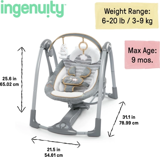 Stel je baby gerust met zacht schommelen, overal onderweg. De draagbare schommel Ingenuity Swing’n Go in het design Bella Teddy biedt een compact opvouwbaar frame, 5 schommelsnelheden, 8 melodieën en 3 natuurgeluiden en een stille motor voor ongestoorde rust. Zachte premium textielen, een afneembare hoofdsteun en een gepolsterde 5-puntsgordel zorgen voor comfort en veiligheid vanaf de geboorte tot 9 kg.