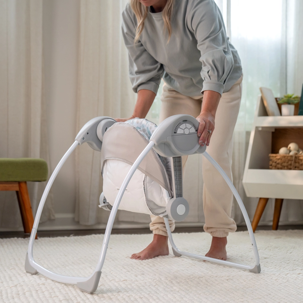 Praktische en draagbare schommel voor pasgeborenen tot 9 kg, met zachte, rustgevende schommelbewegingen, prettige muziek en leuke speeltjes voor visuele en auditieve stimulatie. De WhisperQuiet™-technologie zorgt voor een stille werking, zodat slaap of rust niet wordt verstoord. Dankzij het compacte, inklapbare ontwerp neem je hem gemakkelijk overal mee naartoe – naar de grootouders, het vakantiehuis of voor kleine woonruimtes.