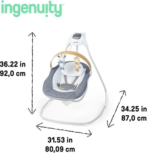 Ingenuity SimpleComfort Chambray is een doordachte babyschommel die comfort, veiligheid en plezier combineert. De 180° draaibare zitting maakt schommelen in drie richtingen mogelijk, zodat je de beweging en de richting naar de ouder eenvoudig kunt aanpassen. TrueSpeed-technologie houdt de gekozen schommelsnelheid constant afhankelijk van het gewicht van het kind en de WhisperQuiet-motor zorgt voor een uiterst stille werking.