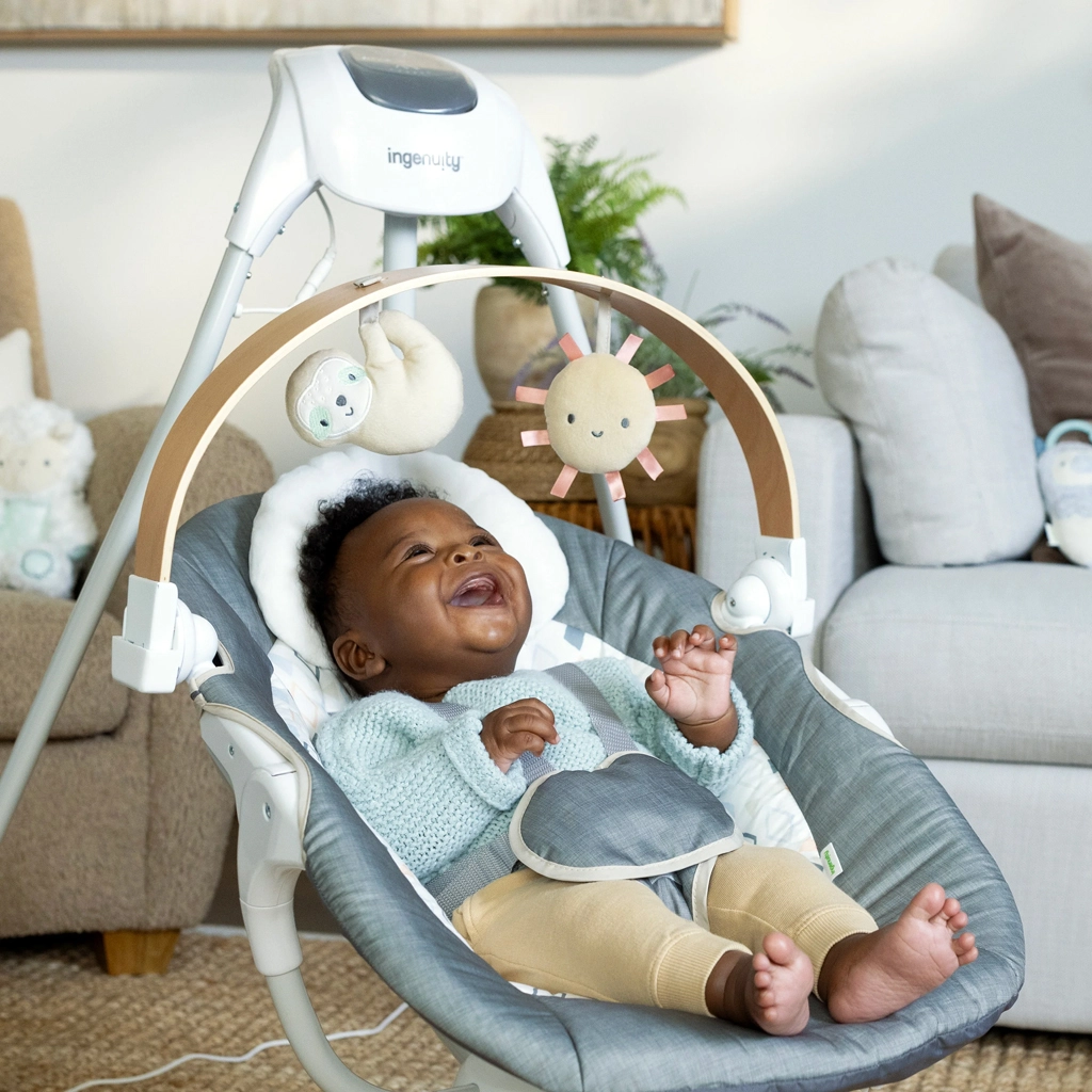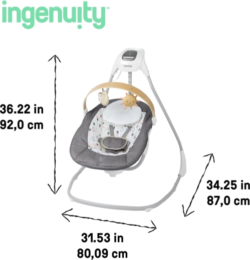 Stel je baby gerust en vermaak hem of haar met de compacte schommel INGENUITY SimpleComfort Parker. Biedt een zitting die 180° kan draaien, schommelen in 3 richtingen, 6 snelheden met TrueSpeed-technologie, een stille WhisperQuiet-motor en 8 melodieën + 3 natuurgeluiden. Handige USB-voeding, een afneembare houten speelboog met 2 speeltjes en een compacte constructie met handgreep en wieltjes maken verplaatsen en opbergen eenvoudig. Voor kinderen vanaf de geboorte tot 9 kg.