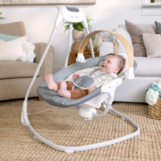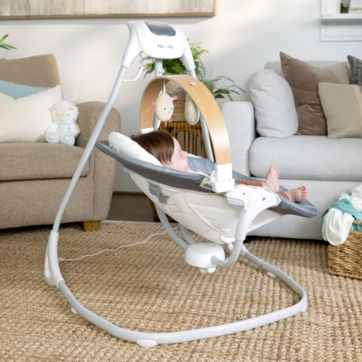 De Ingenuity SimpleComfort Parker schommel brengt comfort, rust en stijl in elk huishouden. De 180° draaibare zitting maakt schommelen in drie richtingen mogelijk, zodat je eenvoudig de positie vindt die het best bij je baby past. De stille WhisperQuiet-motor, 6 snelheden met TrueSpeed-technologie en een timer met automatische uitschakeling zorgen voor vloeiend en ongestoord schommelen.