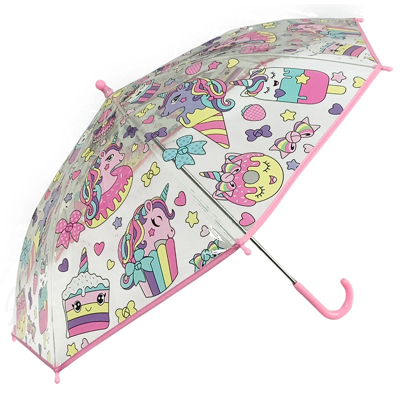 Schattige transparante kinderparaplu met eenhoornmotief beschermt tegen de regen en laat kinderen tegelijk comfortabel de weg zien. Dankzij de lichte constructie en het gemakkelijke gebruik is hij ook geschikt voor jonge kinderen. Transparant design, populair eenhoornmotief en eenvoudig openen maken het een ideale accessoire voor de kinderopvang en op reis.