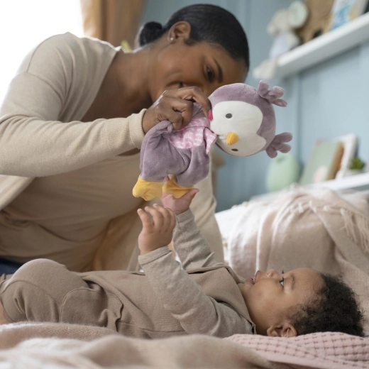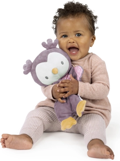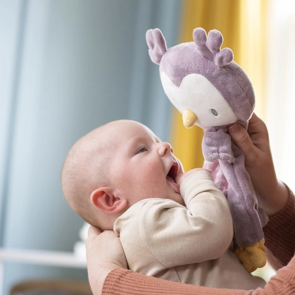 De vorm en de zachte vleugeltjes liggen goed in kleine handjes, waardoor het uiltje ideaal is voor in de kinderwagen, het ledikant en onderweg.