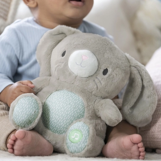 Het schattige pluchen konijntje Sylvi van Ingenuity brengt rust en comfort dankzij kalmerende melodieën, hartslaggeluiden, zachte vibraties en pulserende lichtjes op het buikje. Biedt tot 15 minuten ononderbroken afspelen, activatie door schudden of het indrukken van het pootje en ondersteunt de ontwikkeling van de grove motoriek. De ideale metgezel voor thuis en onderweg.